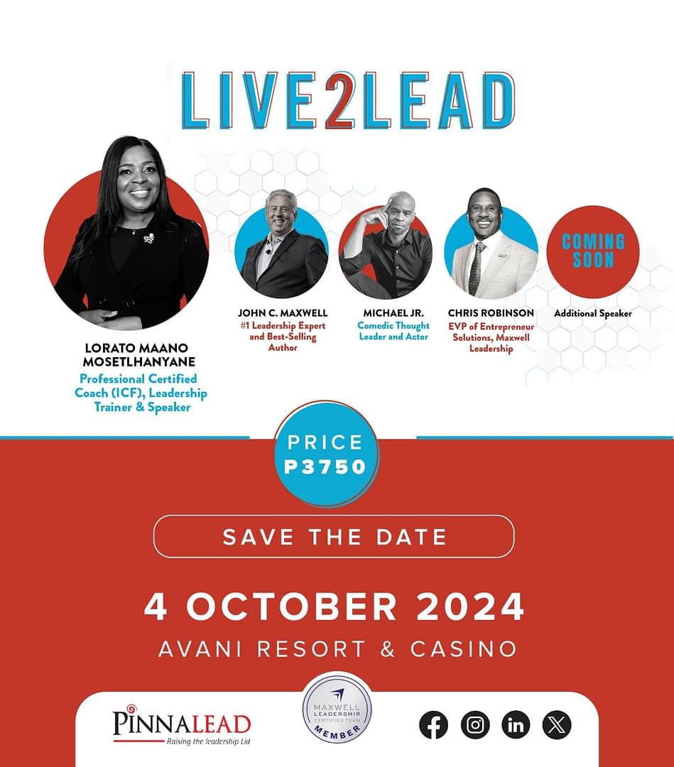 Join Lorato Mosetlhanyane, John C. Maxwell, Michael Jr. and Chris Robinson on the 4th of October, 2024 for the Live2Lead Leadership simulcast at Avani Resort & Casino in Gaborone. Price […]